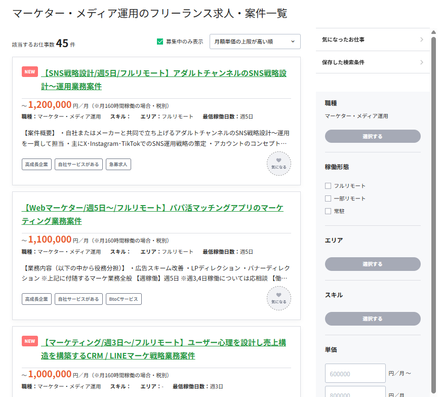 - フリーランスのマーケター向けの案件を十分に保有しているか