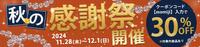 初めまして。tsukiと申します。 秋の感謝祭のバナーを提案させていただきます。 30%OFFが見られるお客様の目に止まるよう目立たせ、秋っぽい色味で制作いたしました。 ご検討のほど、よろしくお願いいたします。