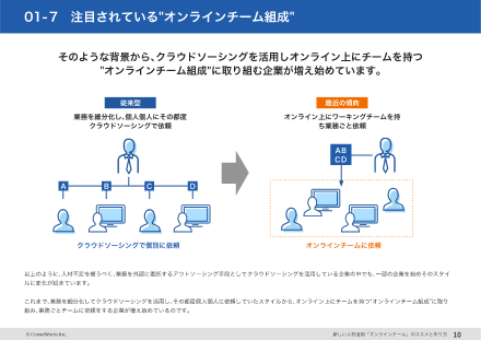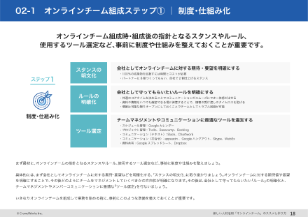 人材不足に企業が対応する方法として「オンラインチーム」が現在注目されています。本資料では、オンラインチームのポイントや作り方を事例と合わせて紹介します。